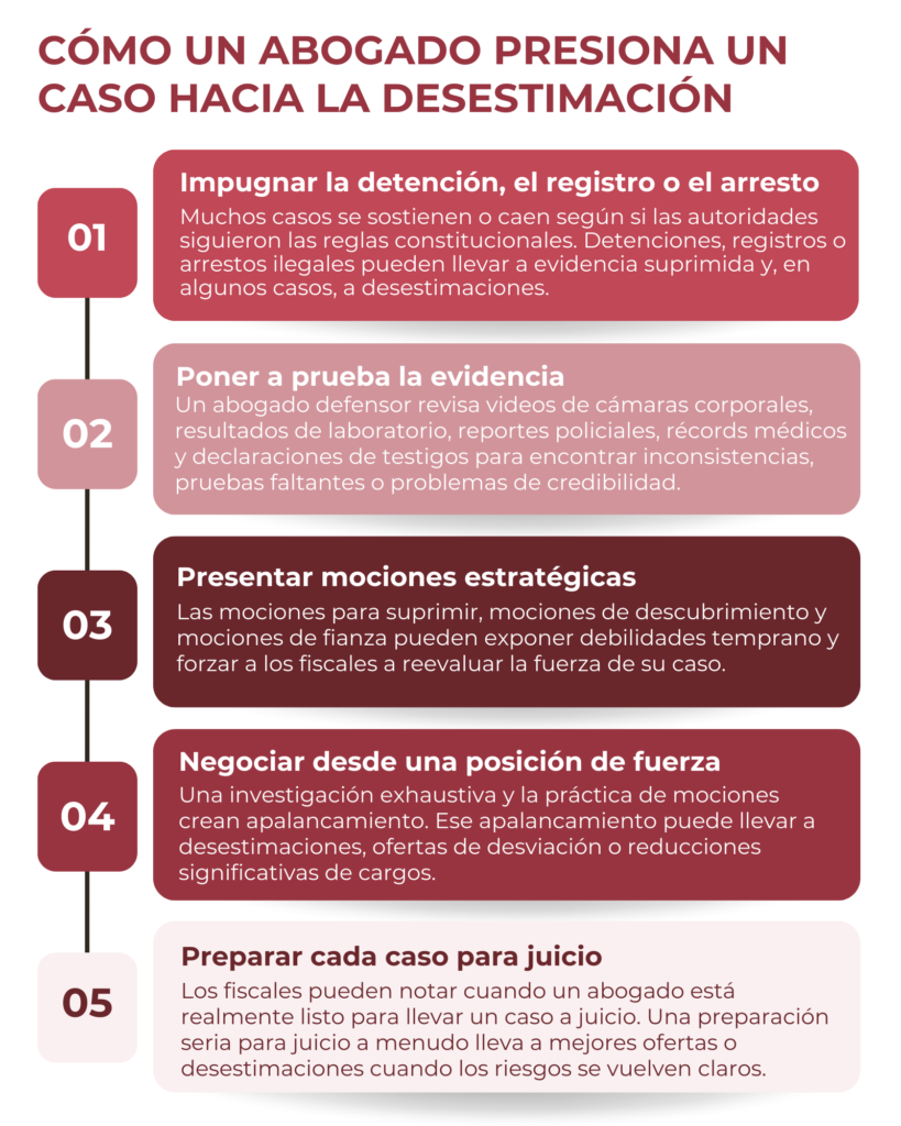 Si estás buscando “¿cómo logro que desestimen mi caso criminal?”, probablemente estés bajo mucho estrés y buscando respuestas reales, no promesas de marketing. La verdad es esta: las desestimaciones sí ocurren, pero generalmente son el resultado de estrategia, timing y presión, no de suerte. Esta guía explica cómo realmente se desestiman los casos criminales, qué significa “el mejor resultado posible” y cómo un abogado defensor puede trabajar tu caso hacia la desestimación, reducción o una resolución que proteja tu futuro.